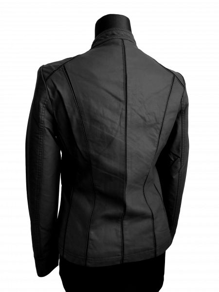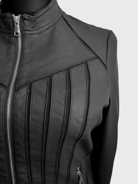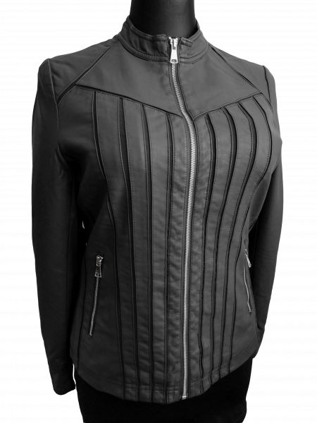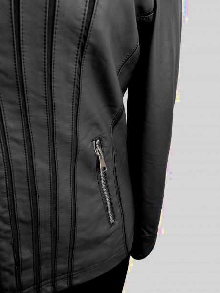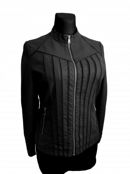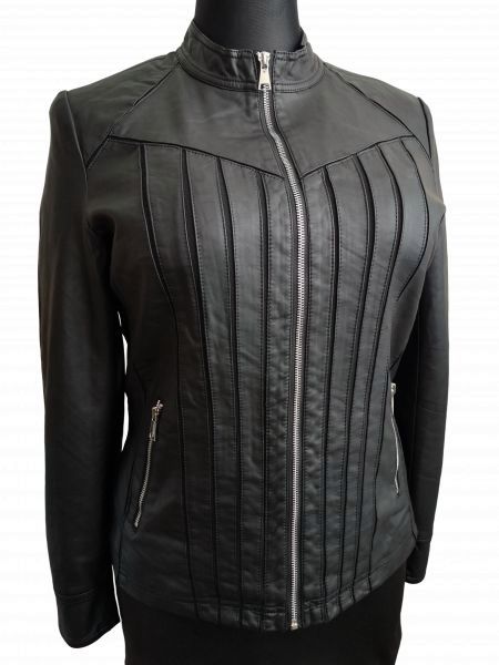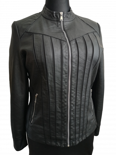 Dámska koženková bunda so stojačikovým golierom a striebornými zipsami. Nositeľka takéhoto modelu zaručene ocení vkusné tvarovanie a zaujímavo riešené prestrihy, ktoré premyslene podporujú ladnosť ženských kriviek..  |